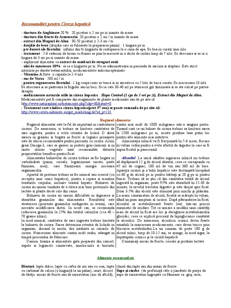 Aveti vreo idee de vreo clinica din romania sau unde este cel mai bun spital ca sa mergem sa tratam aceasta boala incurabila? 1) ciroza hepatica compensată (atunci când lipsesc ascita şi icterul). Ce este ciroza hepatica umeda. Principii de baza ale regimului alimentar in ciroza hepatica. • fara alcool • consumati alimente proaspete sau fierte.