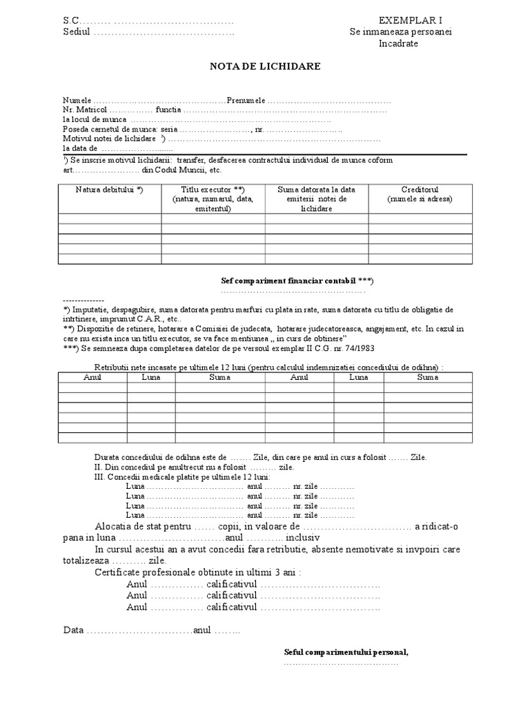 Descarca gratuit model de nota de lichidare sau model de cerere de lichidare. Nota de lichidare, exemplarul 1, se inmaneaza salariatului:
